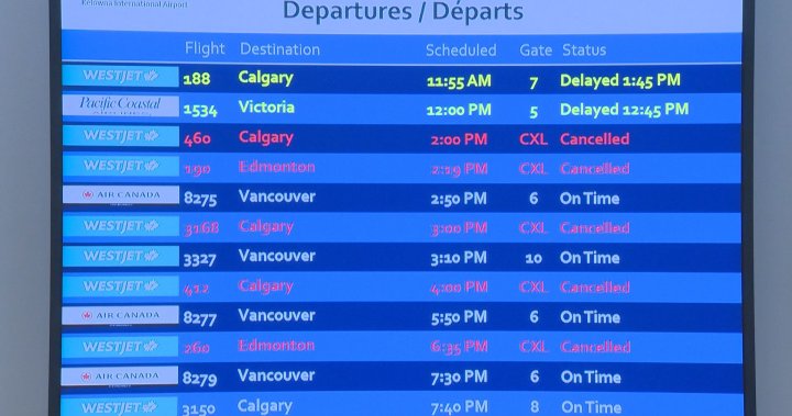 As of Sunday at 10 a.m., the Kelowna International Airport has had to cancel 18 WestJet arrivals and 14 departures. This leaves 32 fewer flights transiting through the airport and more delays for passengers.
