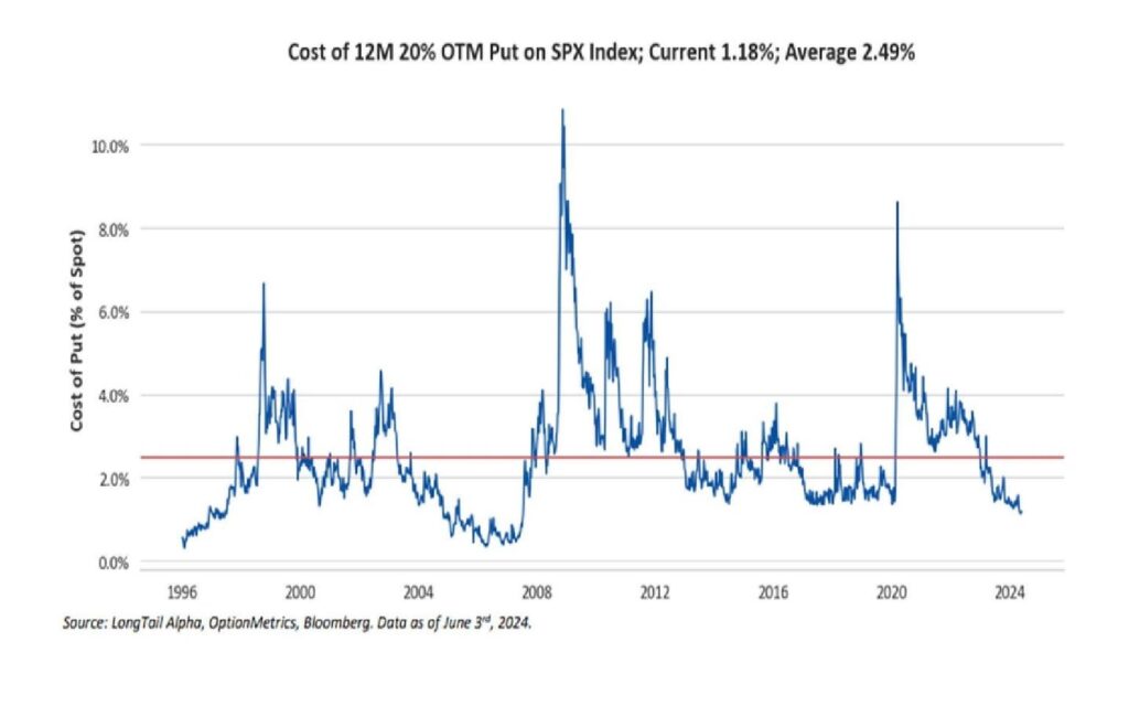 Finally, let’s discuss dispersion and its impact on volatility. The more correlated the performance of a basket of stocks, the less disperse it is. But today, both realized measures and market-implied correlations are at extremely low levels. We can neatly bucket the full S&P 500 into the Fab 4 and everyone else. The Fab 4 rule their own domains as being the best in class, have massive free cash flow, untouchable products (“moats” in analyst lingo), and huge cash reserves on which they are earning plenty of yield thanks to rising short rates. And yes, they can use a lot of the free cash-flow to buy back their own stock, setting a floor to how much market forces can bring them down. The higher the stock price, the more access to capital they have, and the more their stock is worth as currency to acquire other businesses. The rest of the index stocks are in a more precarious position and much more exposed to the economy and rising interest rates. In other words, the S&P 500 is made up of “haves” and “have-nots”. If we think simplistically of the index as made up of these haves and have-nots, then the correlation between these two groups is, and should be low, which should, mathematically, result in the volatility of the index being low. We can think of this dynamic in the following way – when one group tends to do well, the other tends to do worse. And since the index is a combination of both, this results in lower index volatility. Indeed the VIX, which is a measured of S&P implied volatility is at lows last seen before the “volmageddon” episode of 2018. Indeed, as the picture below shows, the cost of hedging has fallen to levels not seen since the Global Financial Crisis.