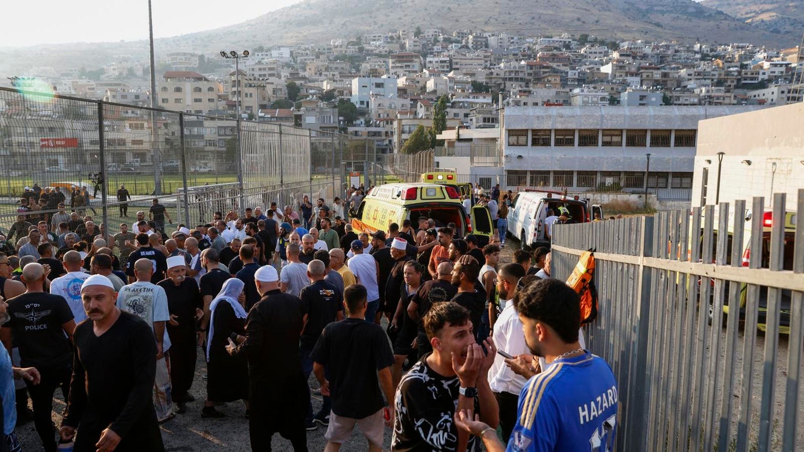 A rocket sent from Lebanon struck a soccer field in Israel’s Golan Heights territory on Saturday, killing at least 10, Israel said, immediately blaming the Lebanese militant group Hezbollah—which denied the claim—just hours after an Israeli airstrike at a school in the Gaza Strip left at least 30 dead.