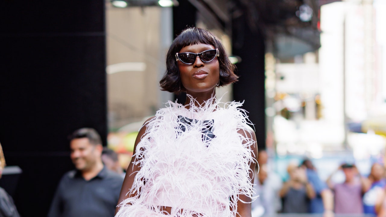 The actor took the pantless trend for a spin today in Midtown Manhattan, when she appeared on Good Morning America to promote her new show Star Wars: The Acolyte. But if you think that Turner-Smith is going to do the same old, Edie Sedgwick-inspired take on the trend as everyone else, you’d be sorely mistaken. Instead, she opted for a pale pink sleeveless top and pair of briefs, both of which were covered in ostrich feathers. The set, from Shushu/Tong’s fall 2024 collection, shown in Shanghai, also capitalized on the bow trend, with a black velvet ribbon affixed to the chest.