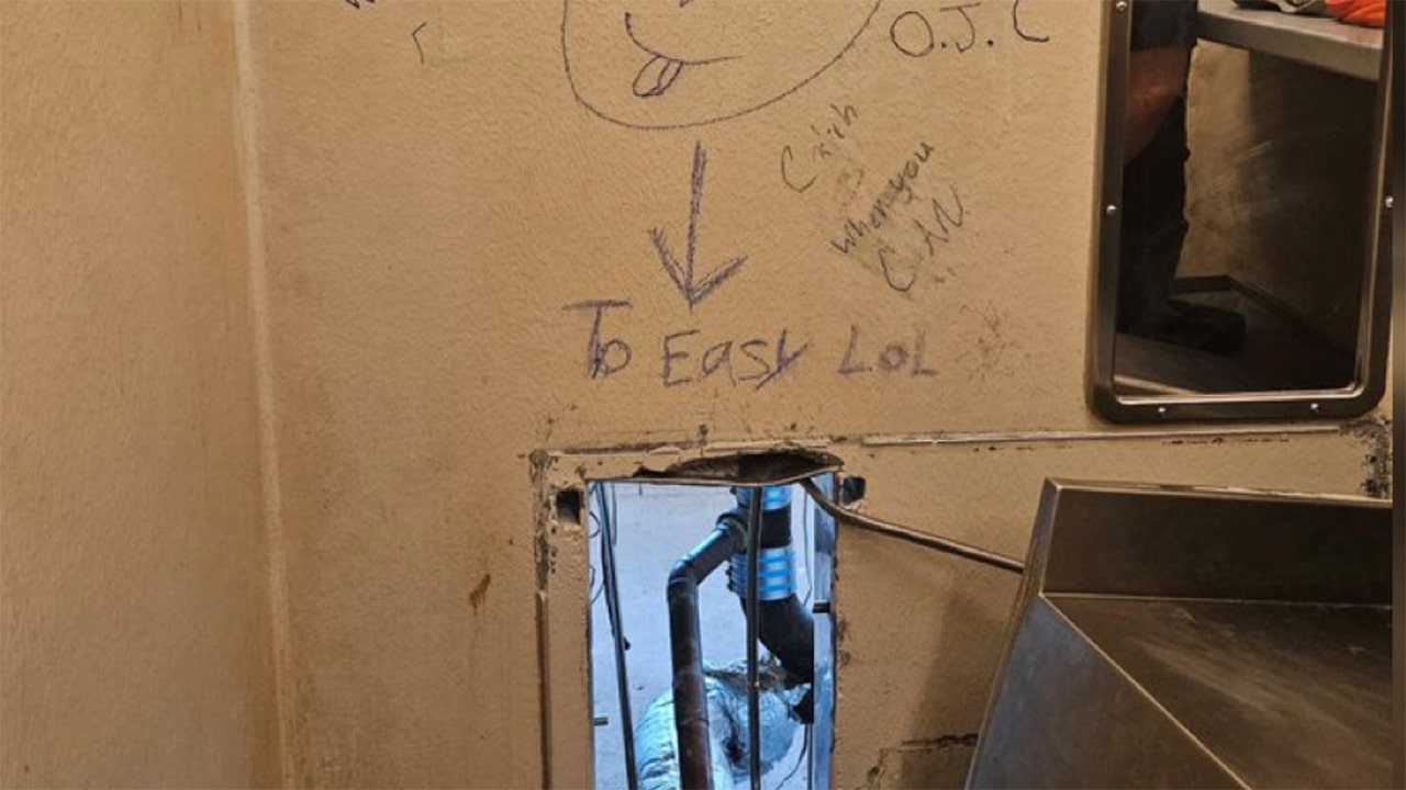 They left behind messages including “To Easy LOL” and “WE INNOCENT” on the wall next to the hole through which they escaped.Â