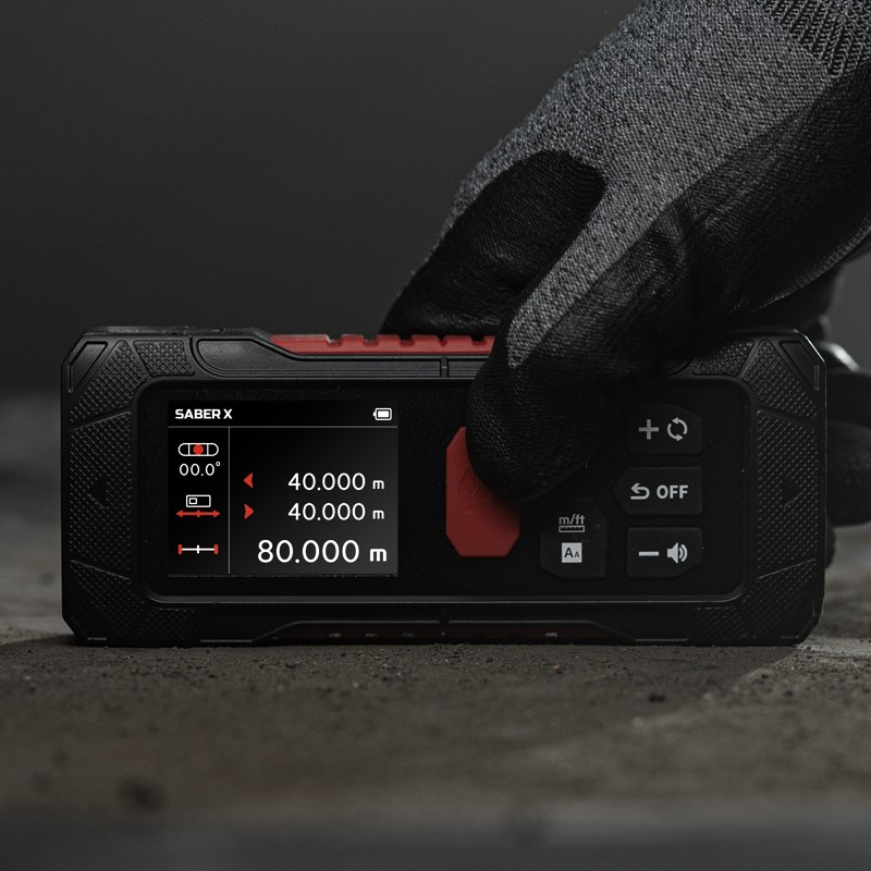 The SABER X can measure distances of up to 80 meters with fast and easy two-way measurements. It also features practical additions such as a large-text display mode and screen rotation, designed to improve visibility and ease of use, contributing to high user satisfaction since its release.