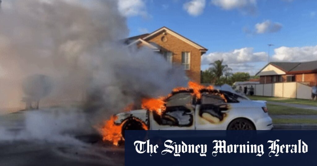 NSW Fire & Rescue were called to a car set alight a suburb over from the fatal shooting.Credit: Fire & Rescue NSW Smithfield