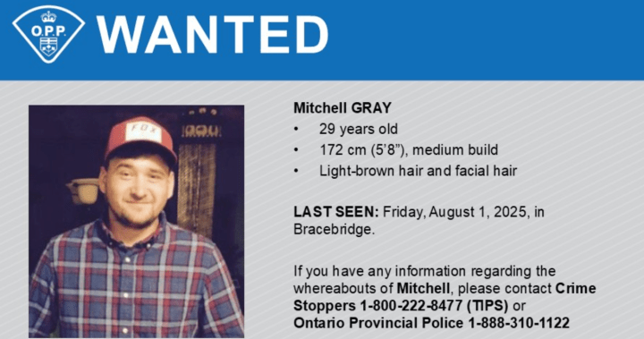 The OPP says Mitchell Gray, 29, of Bracebridge is wanted on a murder warrant. He is described as a white male, approximately 5’8″ tall, with light brown hair and facial hair.