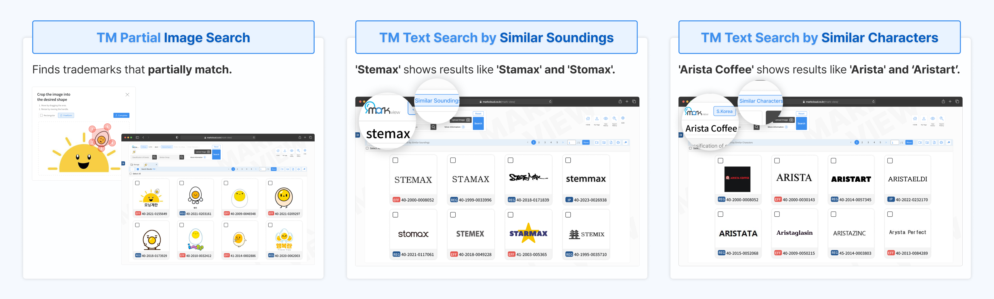 MarkView uses a vast trademark database from patent offices in Korea, the U.S., Japan, and Europe, enabling businesses to streamline trademark registration. It supports partial image matching, phonetic similarity detection, and textual similarity analysis to detect potential trademark infringements.