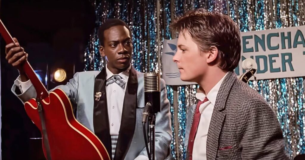“The scene adds a time travel joke, shocking the 1950s teenagers with the kind of music their kids will someday adore. It also releases the pressure from the preceding scenes,” he added. “Tensions resolved; now let’s have some fun.”