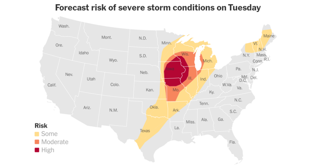 A wide swath of the country, from Kansas City, Mo., to Milwaukee, was in the path of the storm activity, with the highest probability of tornadoes and damaging winds across Iowa, including Iowa City and Davenport.