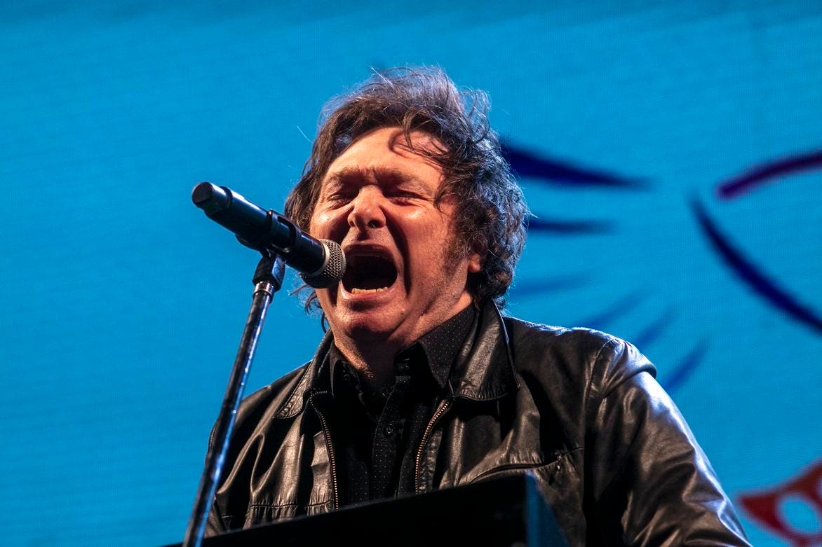 A few days later, Milei used a book launch as an excuse to host a political rally at the historic Luna Park venue in Buenos Aires. That time around, he brought along a couple of musicians to play ‘Panic Show,’ his campaign anthem, allowing the libertarian leader to revive his youth when he played in a cover bands. Wearing a leather trench coat, he jumped around the stage singing the hard rock song to the delight of his faithful followers. The rally had the usual mystical hues that characterize Milei’s particular brand of ‘the cult of the leader’ – one part messianic preaching, one part stand-up comedy (including the roasting of his adversaries) and one part Austrian economic theory lecture.