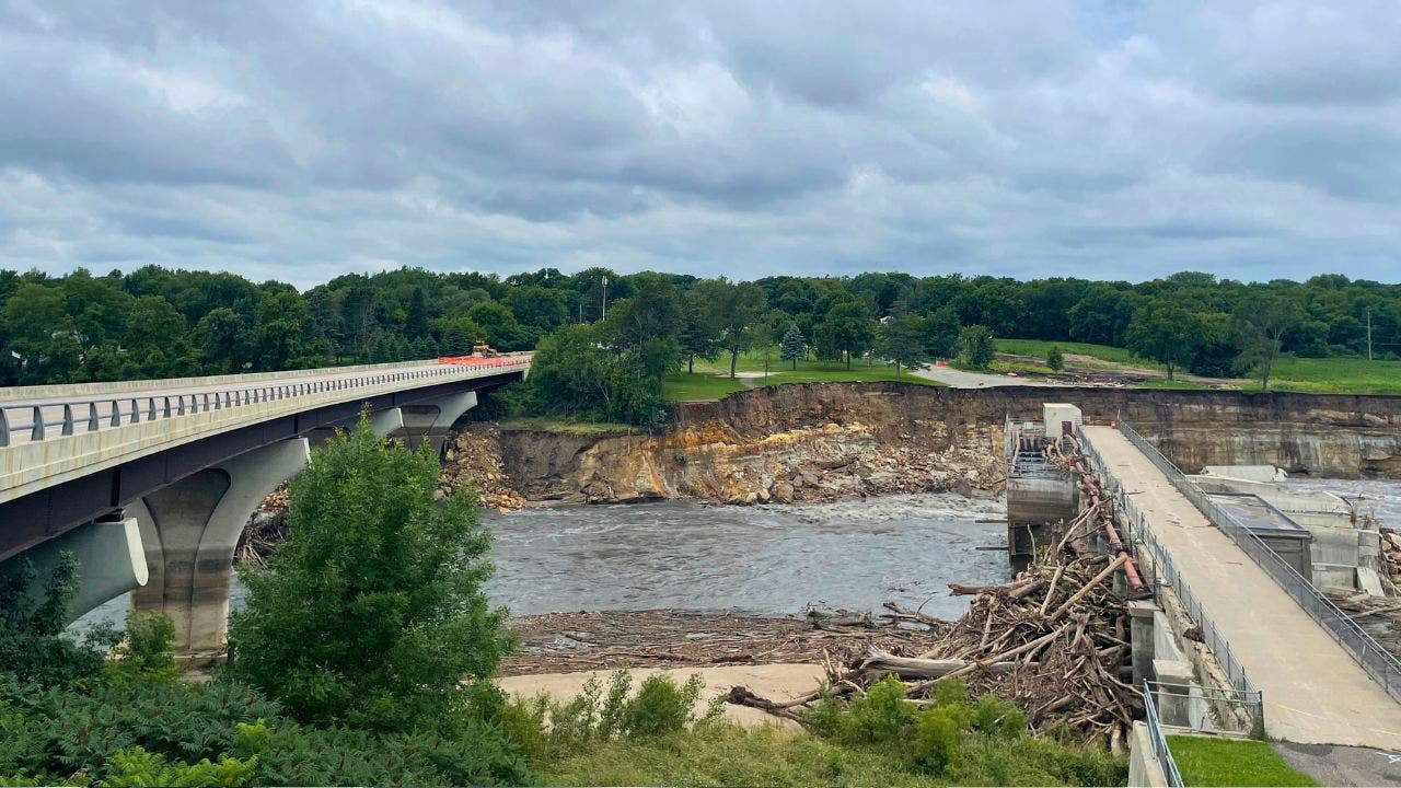 “Right now, again, we believe it’s approximately 50 percent exposed. And as the river level continues to decrease and cut the riverbed elevation down, we’re very concerned about the potential for partial or full failure of the bridge,” Thilges said. “With that being said, the bridge has been closed since the dam began to overtop Monday morning and we’ll continue to keep it closed for public safety.”