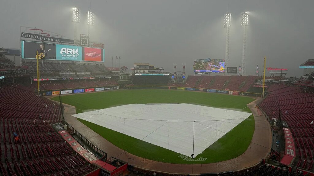 The Reds were hosting the Los Angeles Dodgers on Sunday when in the sixth inning, umpires called for the tarp to come on the field — Cincy was up 4-0, aiming for the three-game sweep.