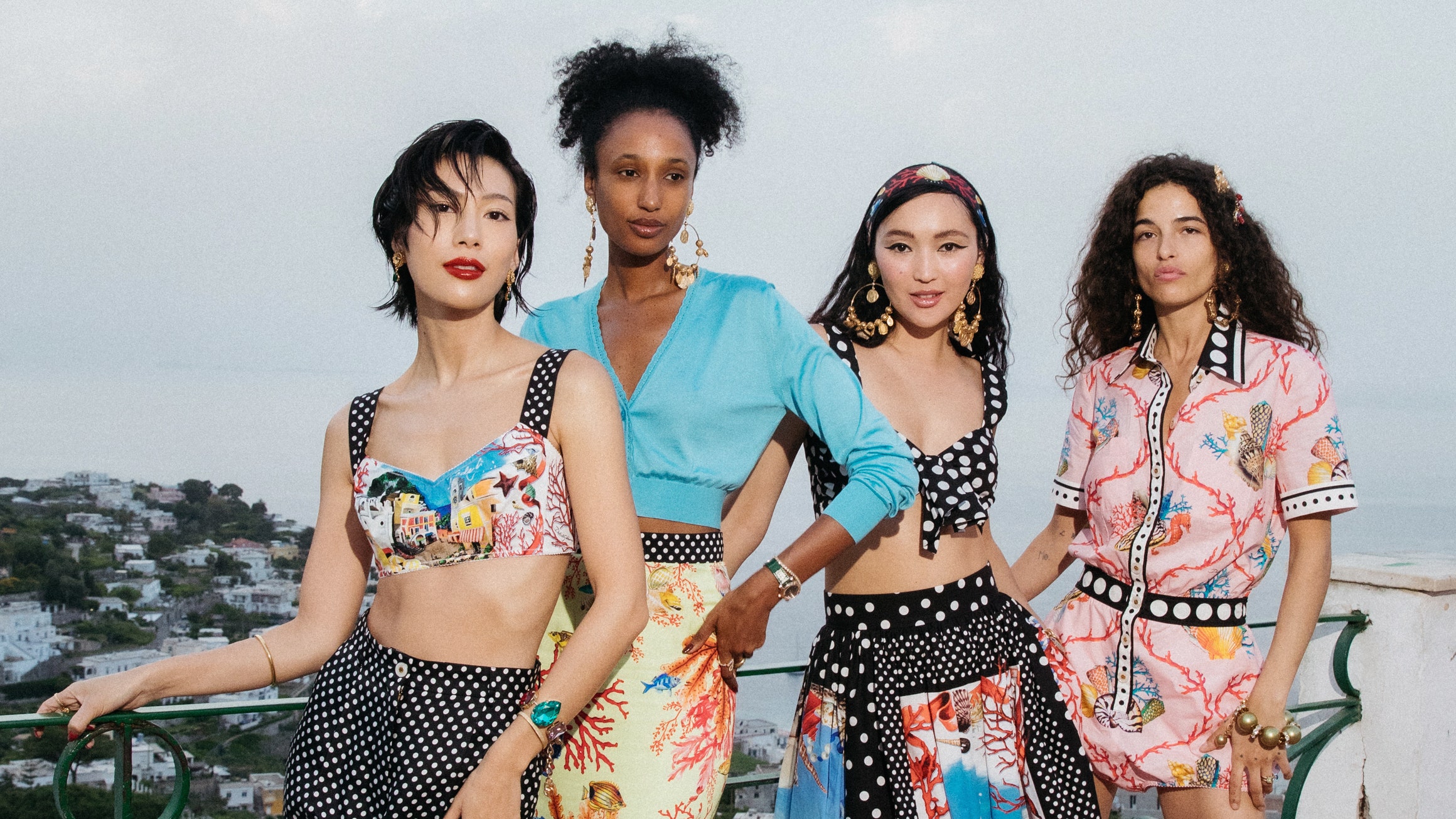 The collection, which launched exclusively on Mytheresa on May 1, feels like a postcard from Capri: scenes of the Faraglioni cliffs and iconic plazas are painted onto crop tops, mini skirts, shirt dresses, breezy blouses, palazzo pants, and jaunty head scarves. (Nods to the area’s world-famous lemon groves, meanwhile, are more subtle: note the tarte au citron-colored cardigans and tunics, the latter splashed with starfishes.) Many of these tableaux are framed by a border of black-and-white polka dots, adding some bygone holiday glamor—while also keeping it all classic D&G.
