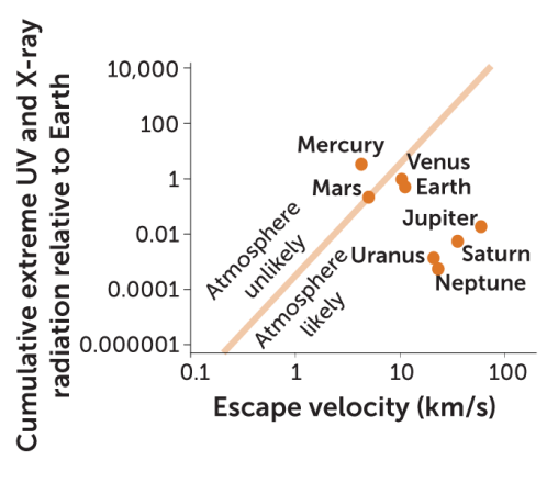 Astronomers are searching for what they call the “cosmic shoreline,” a conceptual dividing line that separates worlds with and without atmospheres. In 2017, scientists identified such a shoreline within our solar system, set by the balance between the amount of radiation a planet or moon receives from the sun and the strength of the world’s surface gravity. Sunlight provides gas particles with the energy needed to escape from the upper atmosphere, while gravity holds atmospheric gases to the planet.