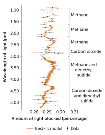 As an exoplanet orbits its star, starlight passes through the planet’s atmosphere, and light at specific wavelengths is absorbed depending on the gases present. This leaves traces in the spectrum of starlight, which scientists can use to figure out which chemicals the light passed by. JWST is sensitive to infrared wavelengths where these traces are strongest and has already detected water, carbon dioxide, methane and more on other worlds.