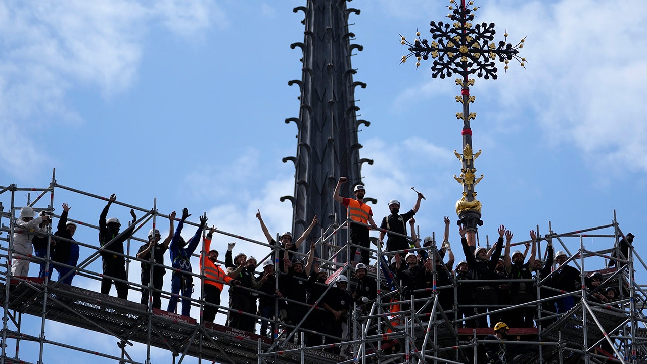 The cross at the apse of Notre-Dame de Paris, which survived the devastating 2019 fire, was reinstalled atop the cathedral’s framework Friday after a meticulous restoration by artistic ironworkers from Normandy.