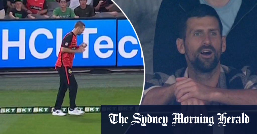Novak Djokovic reacts in the stands as Kane Richardson takes a catch on the boundary to dismiss Marcus Stoinis.