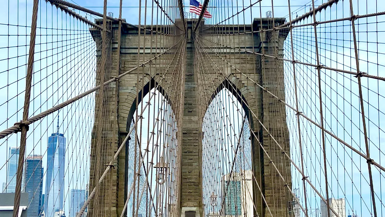 Known for its stone arches, the Brooklyn Bridge supports six lanes of vehicles (no trucks) and a shared pedestrian and bicycle path, as NYC.org points out.