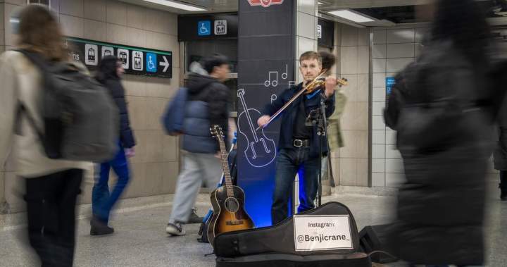 Commuters on the TTC might also run across Benji Crane, a singer who plays guitar and violin. Performing at Dundas West station on a Tuesday afternoon, he sees riders pass by and one even stops and joins in for the chorus of “Shallow” by Bradley Cooper and Lady Gaga, which makes Crane smile.