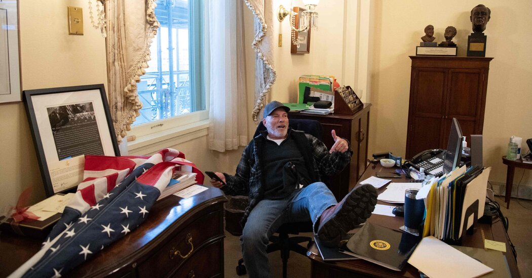 The smirk and the lug-soled boot belonged to Richard Barnett, a 64-year-old former window salesman from Gravette, Ark., who goes by Bigo. He used his time in the office to pocket an envelope with the speaker’s letterhead and scrawl a crude note to Pelosi herself. But it was the photo of him that really lasted, maybe because of the way it mixed vandalism with the threat of violence — he had a stun device on him — and encapsulated the rioters’ mockery of the country’s democratic institutions.