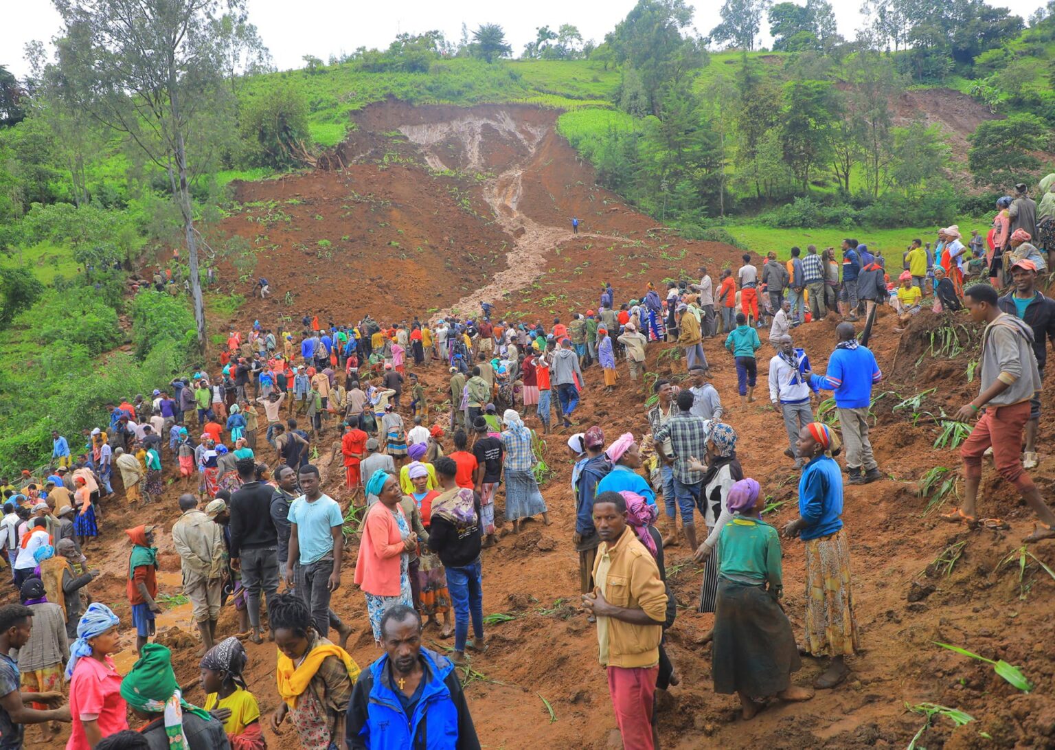 Images shared on social media by the state-affiliated media outlet Fana Broadcasting Corporate showed hundreds of people near the devastating scene of tumbled soil, using their hands to dig through the dirt.