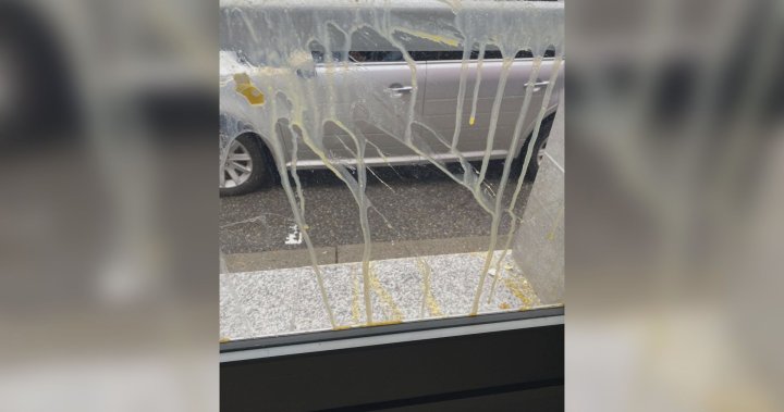 Surveillance footage captured a vehicle passing by the building around midnight on Sunday, with passengers hurling eggs at the windows.