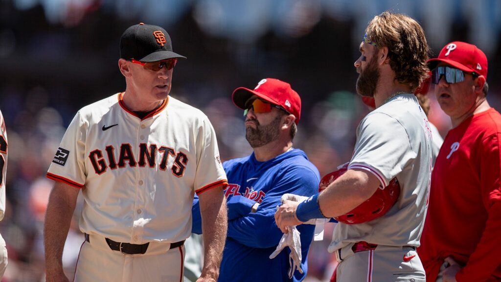 Players emerged from their respective dugouts after Giants pitcher Kyle Harrison threw back-to-back fastballs high and inside.
