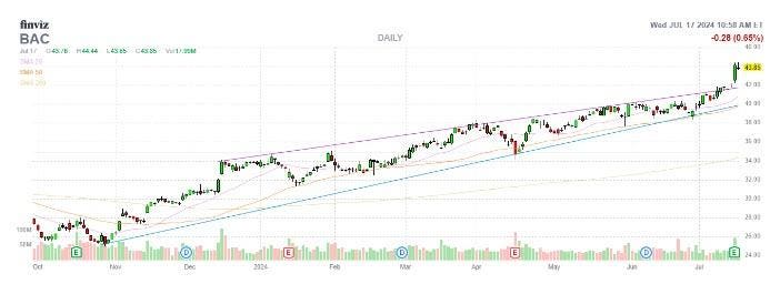 Bank of America (BAC) is fresh off its Tuesday post-earnings pop of 5.3%, after the financial institution reported a top-line beat for the second quarter. The shares today hit a two-year high of $44.44 in response, and are now up 30.9% in 2024, with support in place at their ascending 50-day moving average. If past is precedent, the bank stock could have even more room to run, thanks to a bullish combination flashing on the charts.