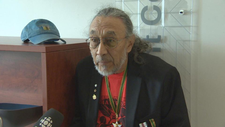 Ratt recollected the honours he’s been bestowed upon by the provincial and federal government over the years as he pointed to the lapel pins on his blazer at the Monday event in Regina. (Will Draper/CBC)