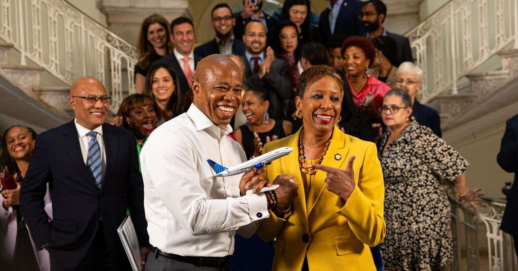 The mayor and the City Council speaker, Adrienne Adams, adopted a celebratory tone at the announcement at City Hall, smiling and holding a model airplane to show that they had “landed the plane” as promised. Mr. Adams said they had found comity to fund important programs as the city faces major financial challenges.