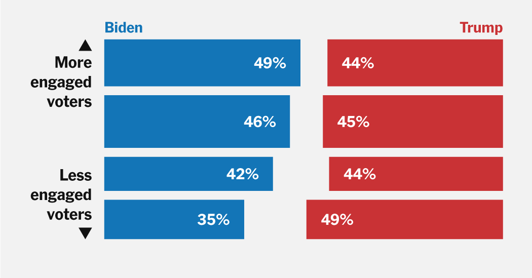 Demographics are not the explanation for Mr. Trump’s strength among infrequent voters. Although these voters are less likely to hold a college degree, they’re still disproportionately young and nonwhite. They would be expected to be Democratic-leaning if they had the same preferences as demographically similar voters who turn out more regularly in elections. Instead, infrequent voters of every demographic group seem less likely to support Mr. Biden in the early polls.