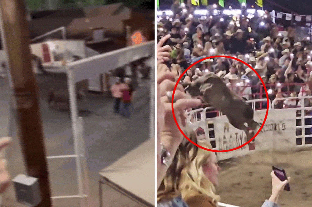 An out-of-control rodeo bull lept out of an Oregon arena and charged through a crowd of spectators Saturday — violently tossing and stampeding a woman who was in its path.