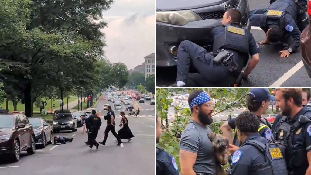 I’m on the ground, my right arm outstretched under the driver’s side. I can smell the fresh rain from the greasy pavement. An officer on the passenger’s side somehow clasps the collar. But the pup wiggles out of it. I poke at it from my side, trying to flush it toward the curb. Finally a mustachioed officer in a U.S. Capitol Police ballcap manages to pull the pooch out from under the car on the curbside.