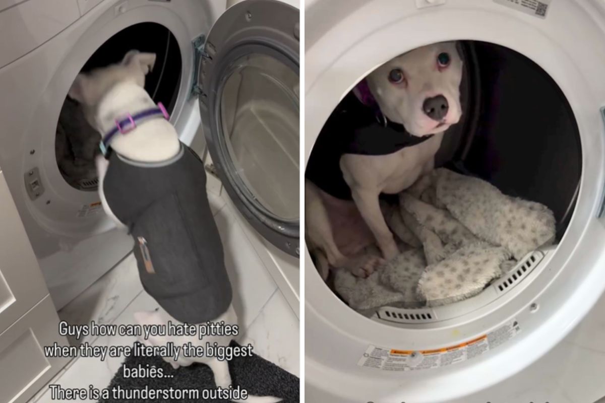 In a February 15 Instagram video posted to the account @kiwi.andthecrew, a pit bull named Roo retreated to the laundry room during a storm, a habit that started by accident. Roo eventually claimed the dryer as her storm sanctuary, and, in the clip, she hops inside with a blanket already there for her while wearing her ThunderShirt, which dog owners use to ease anxiety.