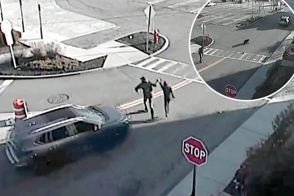 The footage shows the pair crossing the street near the Cross County Center in Yonkers on Feb. 1 when a dark gray SUV blows past a stop sign and knocks the father to the ground — and drags the youngster on the pavement for several feet before speeding off.