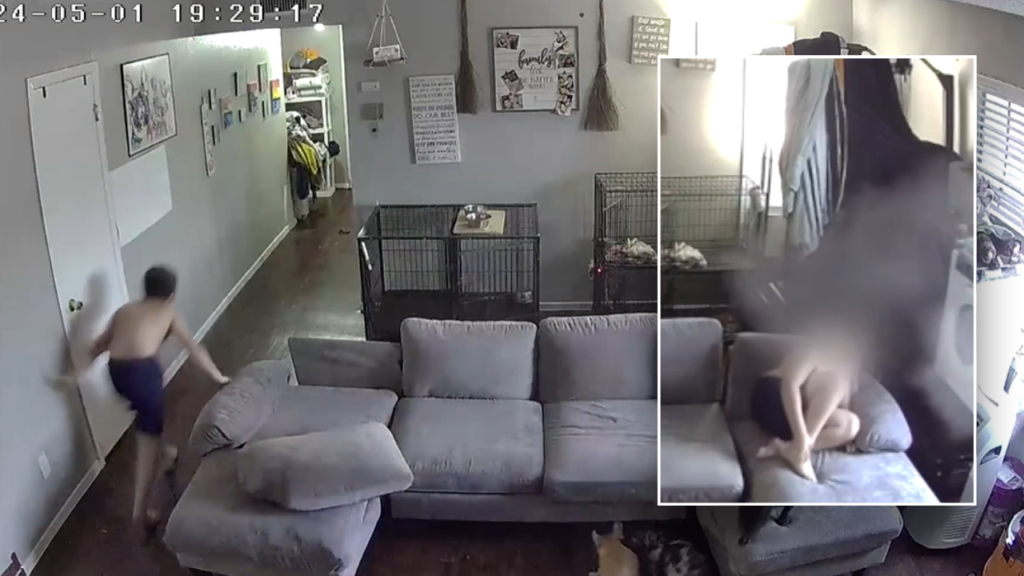 The video, which was taken earlier in May, shows the child crawling on a couch and screaming when he hears the gunfire. Smoke and debris from the gunfire blasts into the living room during the video.