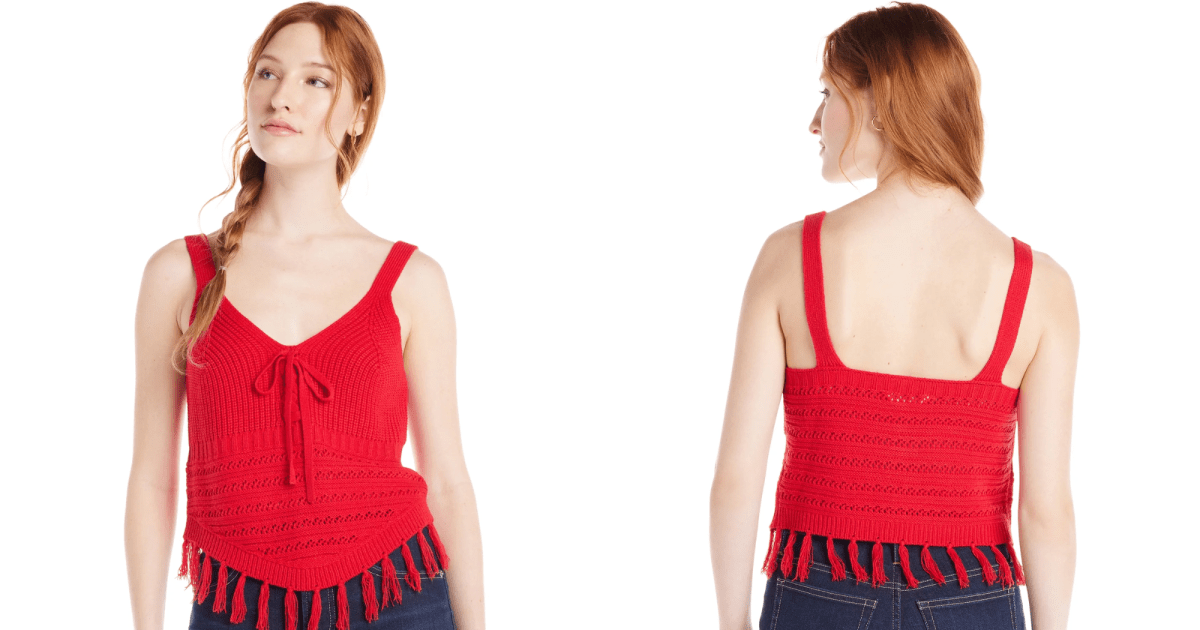 You’ll look like a star in this tank top, which brings together a mixed stitch design and hanky hem that ends in a gorgeous mix of fringe and unfinished sweater knit. It’s a fun way to change things up without going too off-brand, and the sweater knit stands out since it’s summer – and no one would suspect that type of fabric.