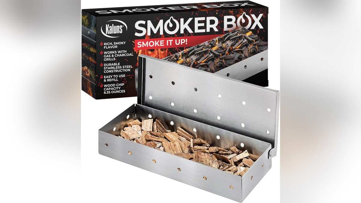 A smoker box allows you to add wood chips that help season anything you’re cooking. The BBQ Guys have a thin smoker box that works with any grill. Amazon also has a more affordable, smaller option.