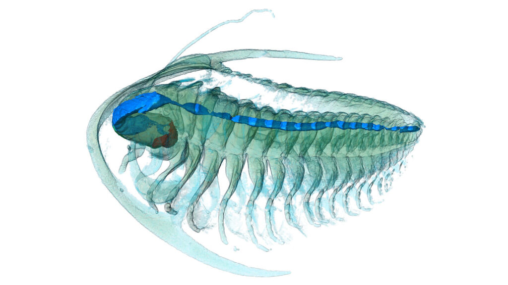 The fossils confirm, for instance, that trilobites ate using the many pairs of legs stretching from their head to their torso. They chewed food along a central groove while passing food particles toward a tiny mouth.