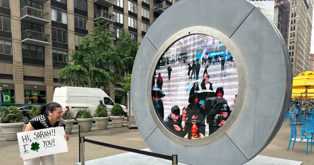 Called “The Portal,” a giant screen and video camera have been placed next to the Big Apple’s famed Flatiron Building and another in O’Connell Street, the Irish capital’s main thoroughfare.