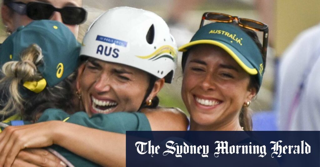 Jessica Fox celebrating with Mum and sister after she won gold for the women’s canoe final at the Vaires Sur Marne Nautical stadium in France.Credit:Eddie Jim