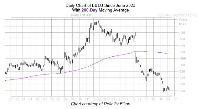 Since the beginning of the year, LULU is one of the worst performers on the S&P 500 (SPX), down 40.5% year-to-date. The equity has struggled especially hard since a mid-March bear gap pushed it below long-term support at its 200-day moving average. What’s more, Lululemon Athletica stock touched a more than 52-week low of $293.03 on May 28 following no less than three price-target cuts, the lowest of which came from Morgan Stanley to $404. Despite this unimpressive technical setup, seasonality suggests some tailwinds may start blowing soon.