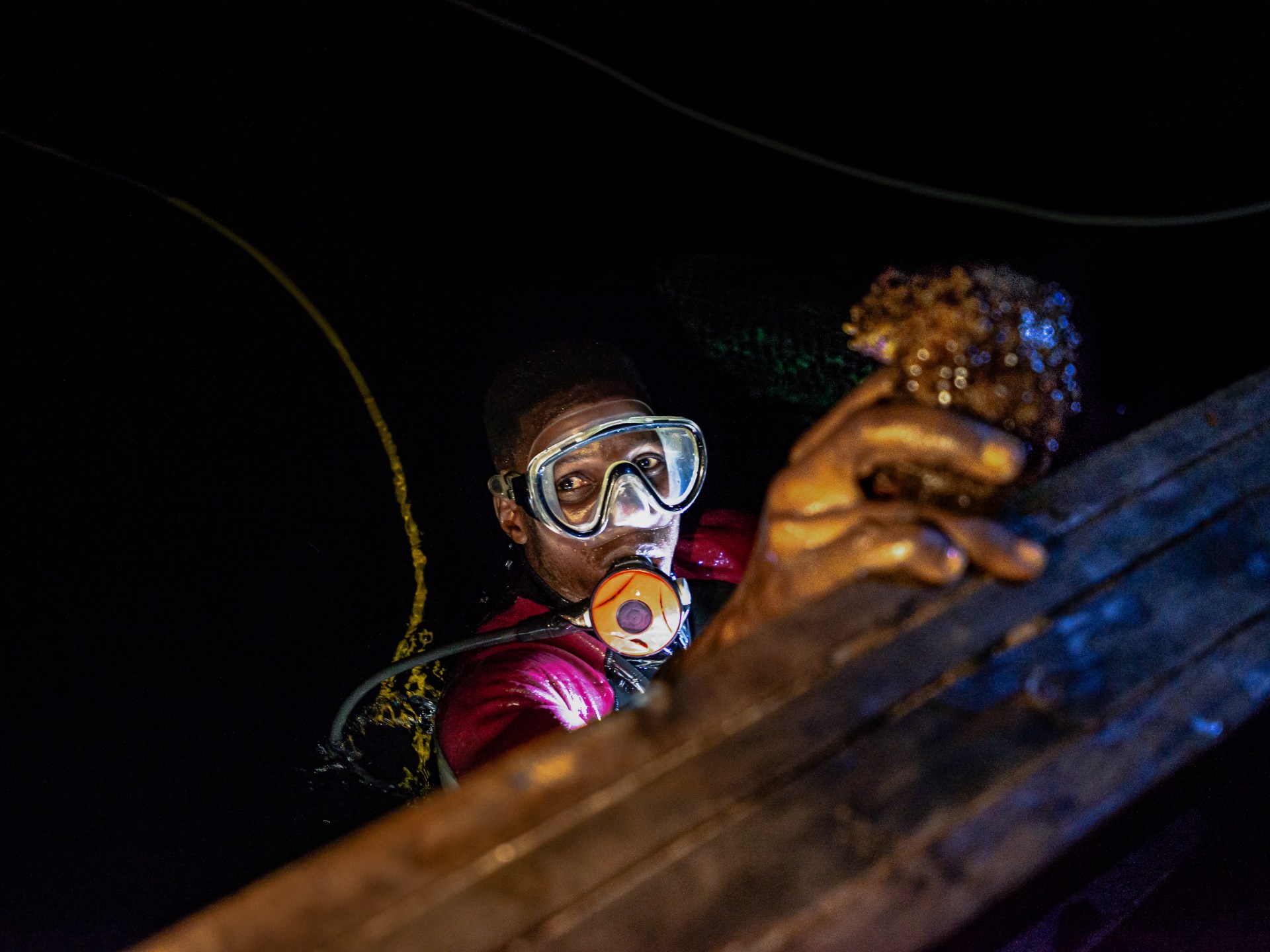 As the diesel engine that powers his air supply rattles in the boat, Jones quietly slips over the edge into the black water. The yellow hose trails behind him as he swims away from the canoe. Minutes later, his torch lights up a column of water above the seabed.