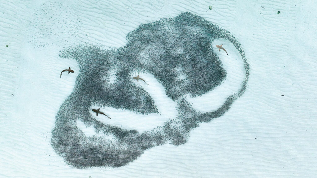 Behavioral biologists Angela Albi and August Paula of the Max Planck Institute of Animal Behavior in Konstanz, Germany, captured the image, a still frame from drone footage, during a study of how sharks interact with each other and their prey.