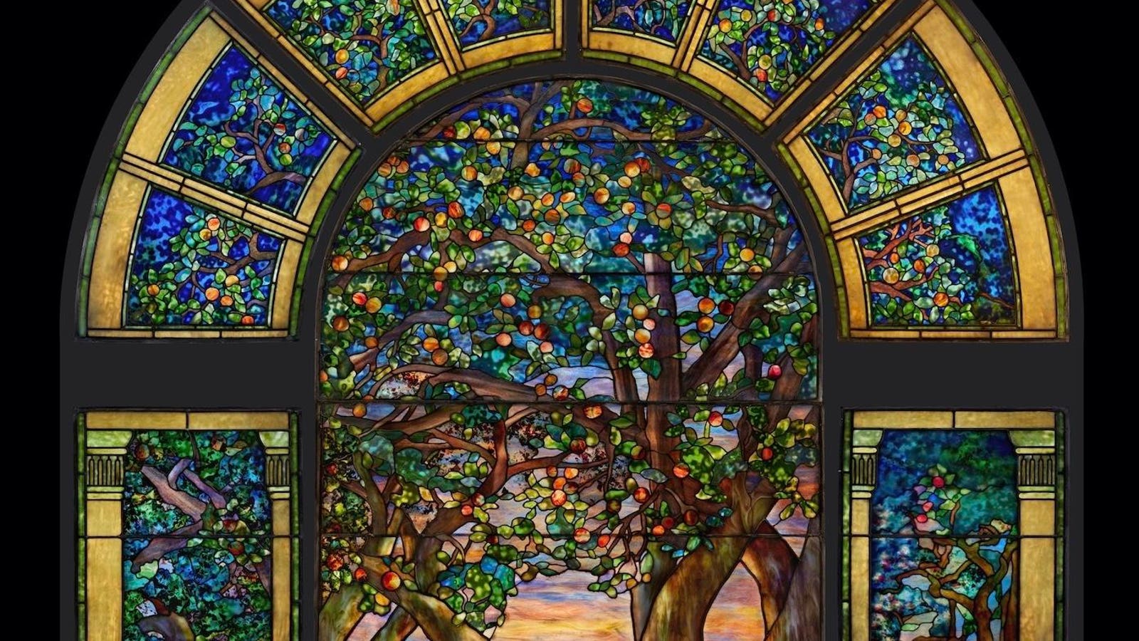 Louis Comfort Tiffany, whose father founded Tiffany & Co., produced stained glass in New York between 1878 and 1933. His creations, most famously windows, lamps and flower cones, were sold on the main floor of the Tiffany & Co. store on Fifth Avenue in New York, as well as in London and Paris stores. Original Tiffany Studios pieces are highly collectable today. Some 3,800 original Tiffany windows remain in the United States today, including at churches in Pennsylvania, Massachusetts and New York and in the chapel of the U.S. Naval Academy in Annapolis, Maryland. The Danner Memorial Window depicts fruit-laden trees on the banks of a river with vibrant red, orange, blue, green and purple hues. Sotheby’s said the work is comparable to famous counterparts like the Metropolitan Museum of Art’s Autumn Landscape Window and the Hartwell Memorial Window at the Art Institute of Chicago.