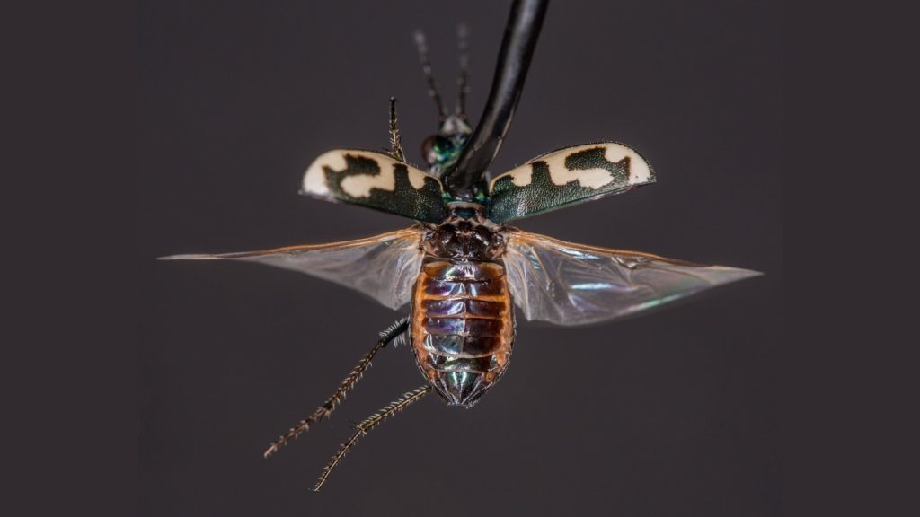 The researchers collected 19 tiger beetle species from southern Arizona and brought them into the lab. They tethered the insects to a metal rod and prompted them to fly. The team then filmed and recorded audio to see how the beetles responded to playback of a bat clicking sequence that immediately precedes an attack. Right away, seven of these species — all nocturnal fliers — pulled their hard, case-like forewings into the path of their beating hindwings. The resulting collisions made high-pitched clicking noises.