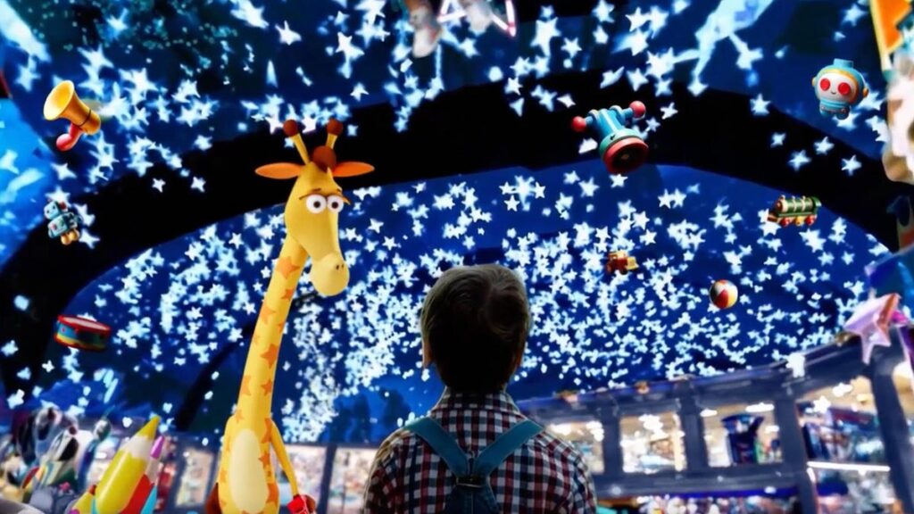 The 1-minute AI-generated video shows a young boy representing Charles Lazarus, the late founder of Toys “R” Us. He falls asleep and wakes in a dream world filled with toys of all types, including an animated version of store mascot Geoffrey the Giraffe. A wistful version of the store’s I Wanna Be a Toys ‘R’ Us Kid jingle plays, and a photograph of the real Lazarus posing with a costume version of Geoffrey is shown.