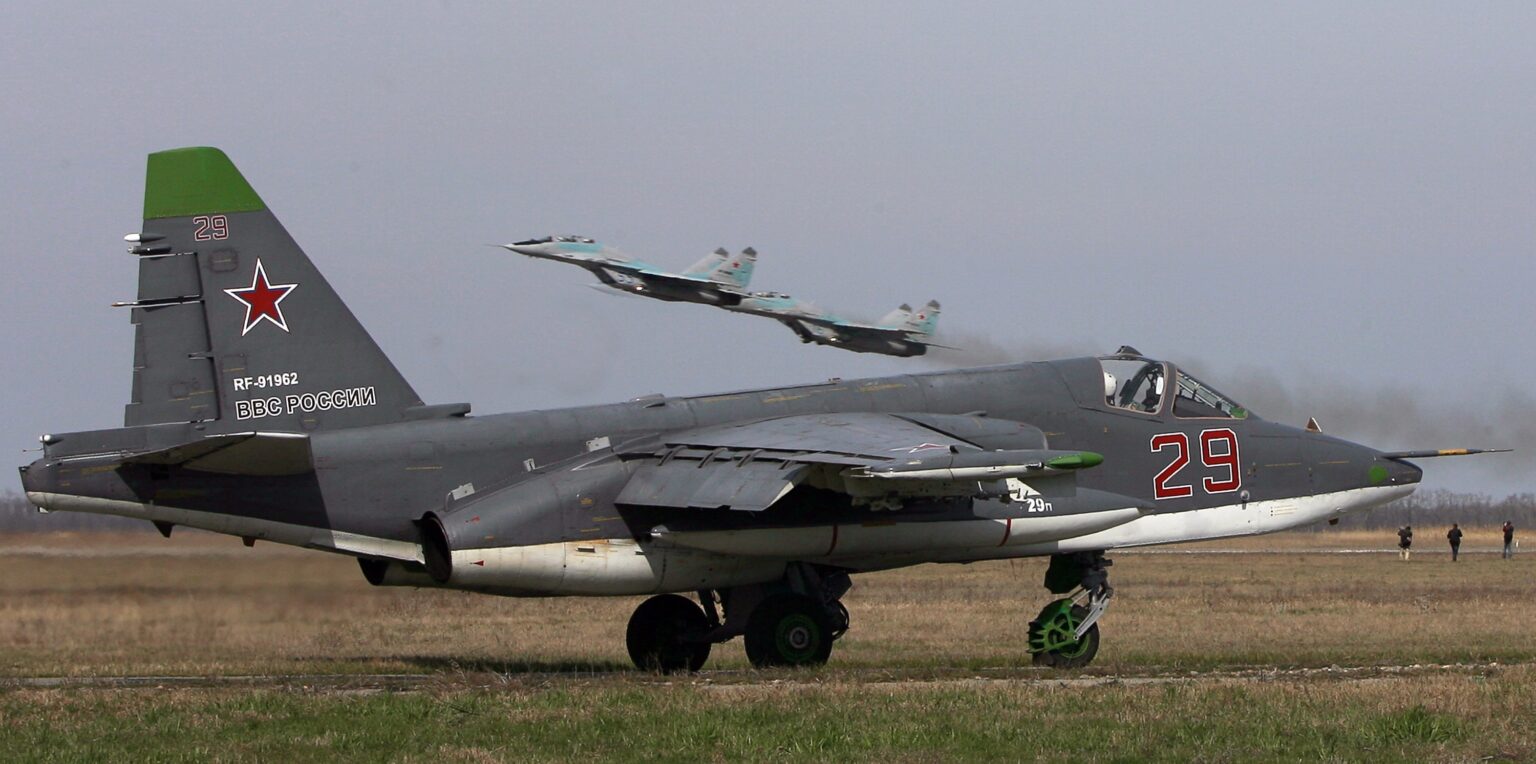 The Su-25 is a Soviet-era jet used to provide air support and destroy specific targets. They are equipped with aerial guns, aerial bombs, unguided air-to-ground missiles, and guided air-to-air missiles.