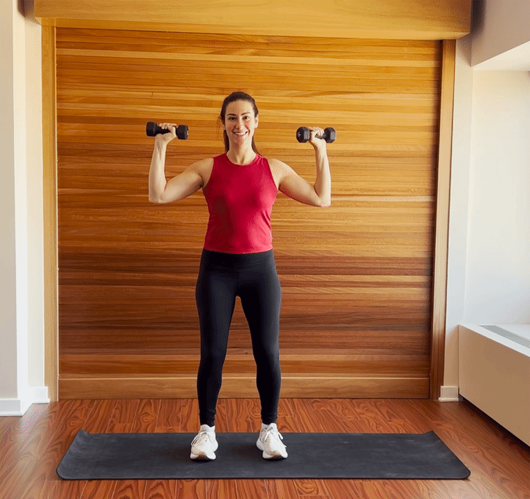 Grab a dumbbell in each hand. Bend the elbows and bring the weights up to your shoulders, with both palms facing each other. This is your starting position. Then, extend your arms up straight up toward the ceiling. Slowly return back to the starting position. Repeat for 10 repetitions.