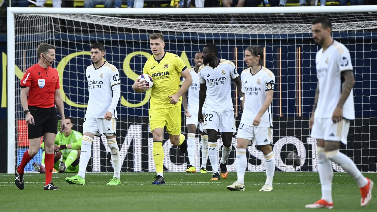 48′ – GOAL! VILLARREAL 2-4 REAL MADRID (Alexander Sorloth): Gerard Moreno plays a wonderful in-swinging cross from the right hand side and Sorloth produces an almost identical header as he did for the first goal to beat Lunin in the bottom left corner.