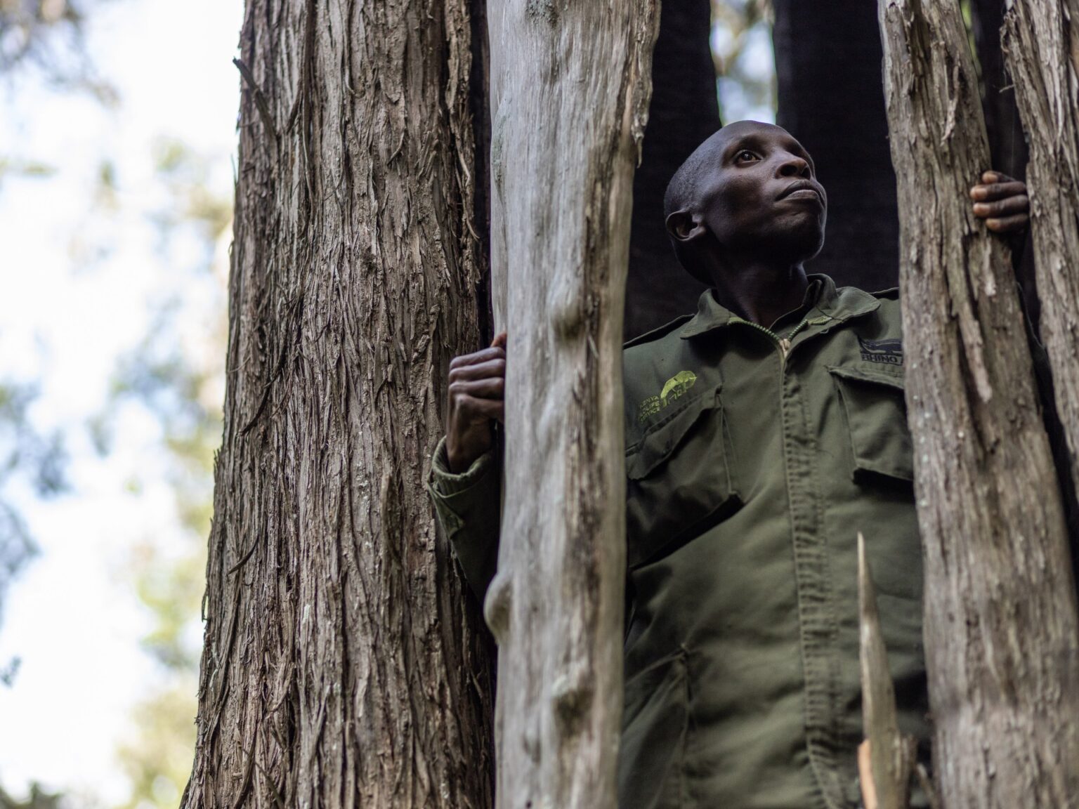 Aberdare National Park, Kenya – Beneath the dense canopy of redwood trees, a uniformed group flanked by armed men treads silently through the thicket, dodging the overgrown stinging nettles that spill over the narrow trail with impressive skill.