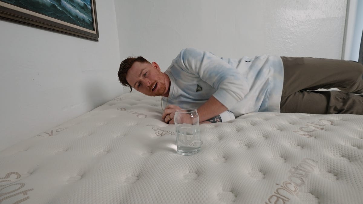 With one person lying still on the bed and the other moving around, we tested its motion-isolating abilities. We also tested it by placing a glass of water on the bed and bouncing and rolling around. Dillon felt the mattress had pretty decent motion isolation. I found it so-so and thought it might not work well for me in that regard — not just because Jess constantly jumps on and off the bed, but because Dillon and I frequently go to bed and wake up at different times. As a night owl, he tends to go to bed later, and I usually wake up earlier. Having a mattress that absorbs motion and won’t jostle the other person awake would be helpful since we often get in and out of bed at different times.